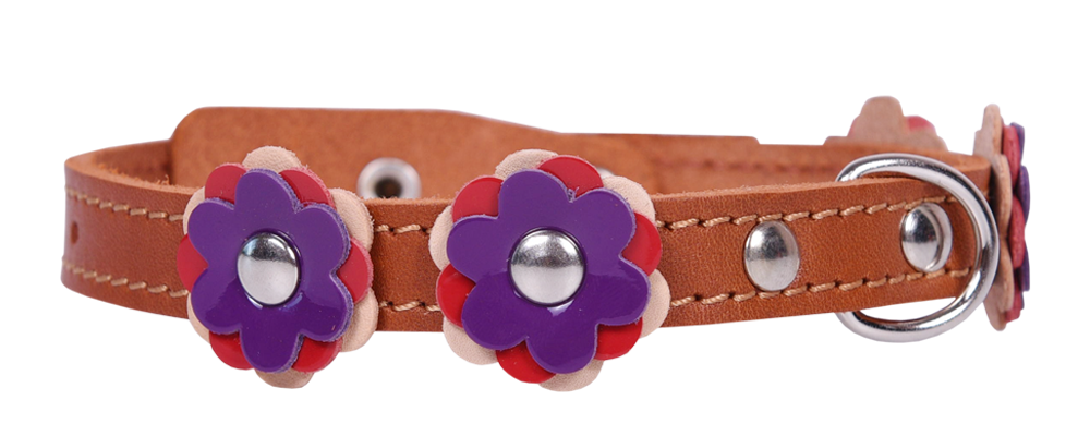 Однослойный ошейник из натуральной кожи с украшением "цветы", прошит декоративной строчкой, полукольцо посередине.