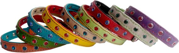 Ошейник из 4-х слоев мягкой искусственной кожи, проклеенный и прошитый декоративной строчкой, края в загибку. Украшен стразами. Полукольцо у пряжки. Цвета в ассортименте.