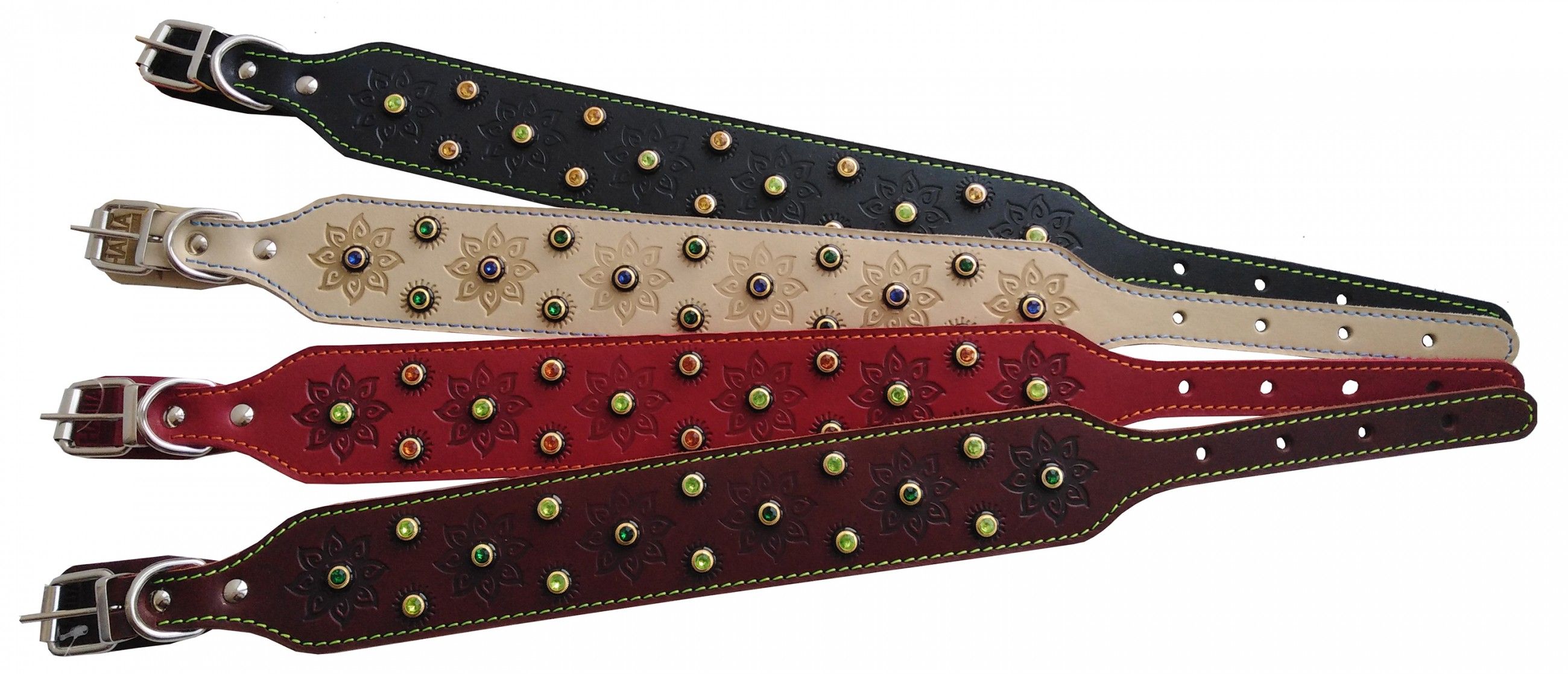 Стильный двухслойный ошейник-борзятник из натуральной кожи, проклеен, прошит декоративной строчкой, украшен стразами и тиснением, полукольцо у пряжки.