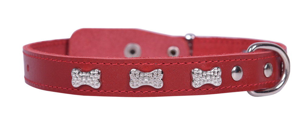 Однослойный ошейник из натуральной кожи с украшением "люкс" (возможные варианты - косточки, собачки, лапки, бантики, цветы), прошит декоративной строчкой, полукольцо посередине.