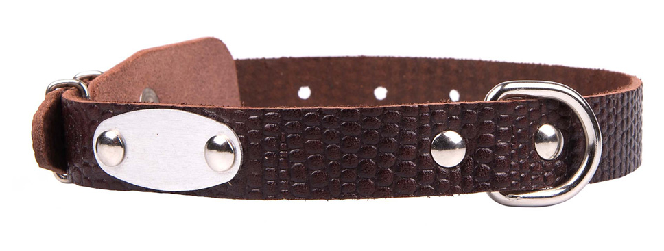 Однослойный ошейник из тисненой натуральной кожи с металлической адресной биркой, не прошитый, полукольцо посередине.