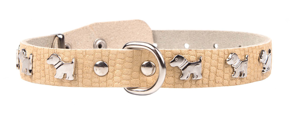 Однослойный ошейник из тисненой натуральной кожи с украшением "люкс" (возможные варианты - косточки, собачки, лапки, бантики, цветы), не прошитый, полукольцо посередине.