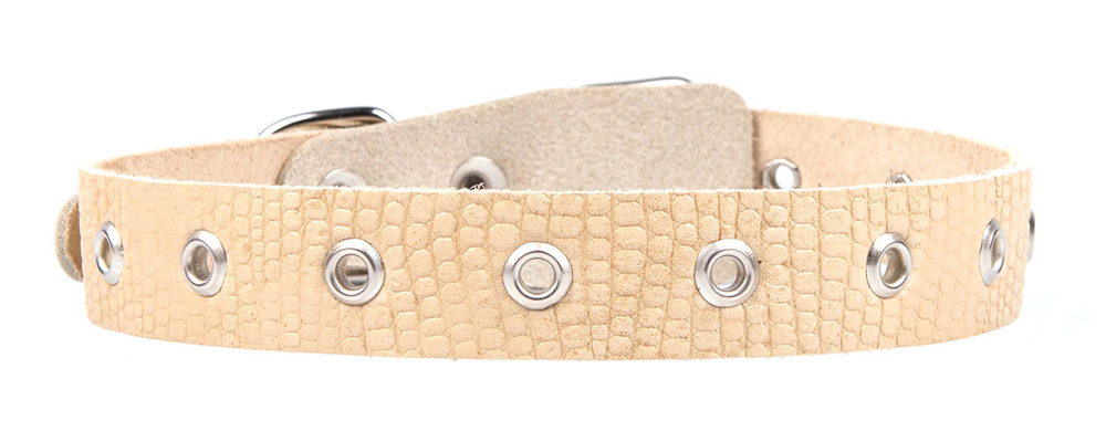 Однослойный ошейник из тисненой натуральной кожи, не прошитый, отверстия укреплены металлической блочкой, полукольцо у пряжки.