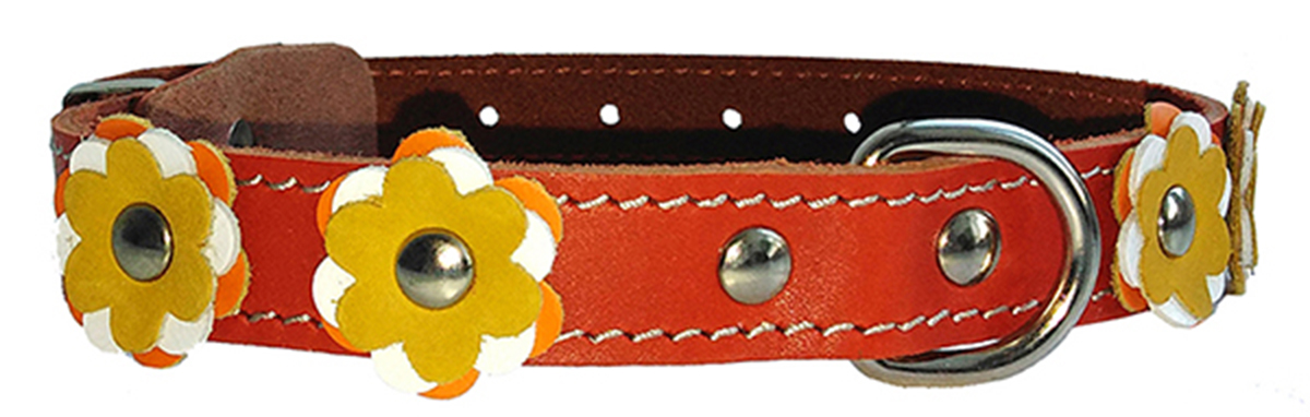 Однослойный ошейник из натуральной кожи с украшением "цветы", прошит декоративной строчкой, полукольцо посередине.