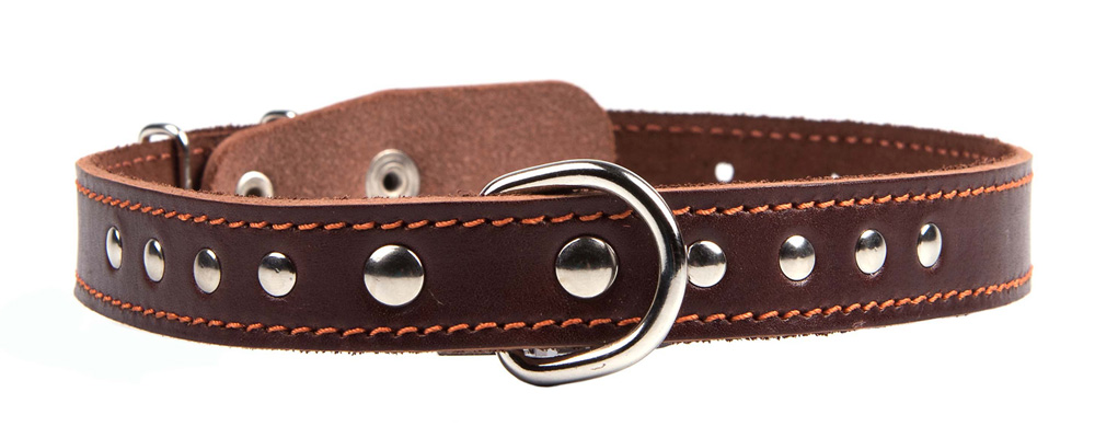 Однослойный ошейник из натуральной кожи, украшенный металлическими заклепками, прошит декоративной строчкой, полукольцо посередине.