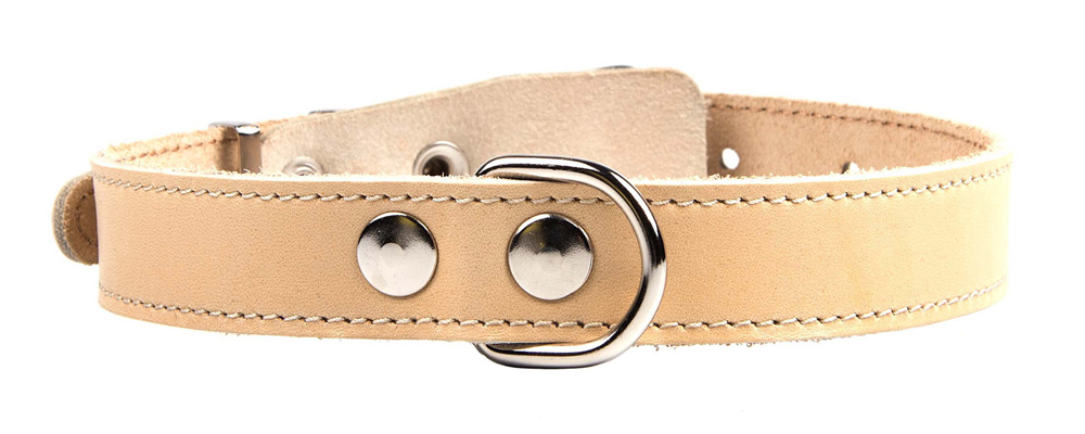 Однослойный ошейник из натуральной кожи, прошит декоративной строчкой, отверстия укреплены металлической блочкой, полукольцо у пряжки.