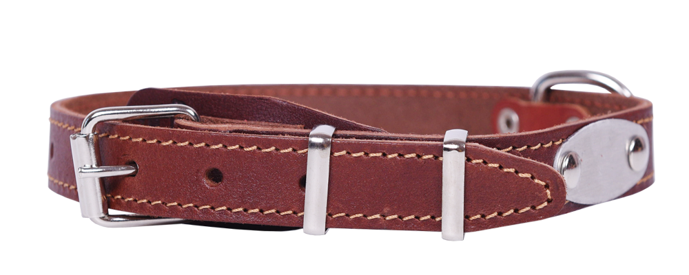 Однослойный ошейник из натуральной кожи, с металлической адресной биркой, прошит декоративной строчкой, полукольцо посередине.