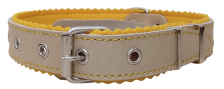 Однослойный ошейник из натуральной кожи, подшитый фетром, украшенный декоративными зубчиками и строчкой, полукольцо посередине.