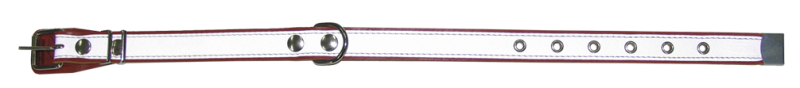Однослойный ошейник из натуральной кожи со светоотражающей полосой, прошит декоративной строчкой, снабжен металлическим наконечником, отверстия укреплены металлической блочкой, полукольцо посередине.