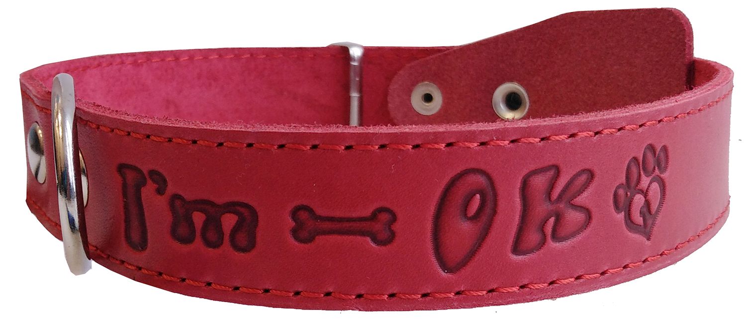 Однослойный ошейник из натуральной кожи, украшенный фактурным тиснением "I`m OK", прошитый декоративной строчкой, полукольцо посередине.
