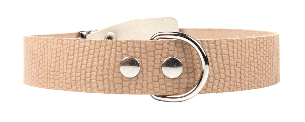Однослойный ошейник из тисненой натуральной кожи, украшенный металлическими заклепками, не прошитый, полукольцо посередине.