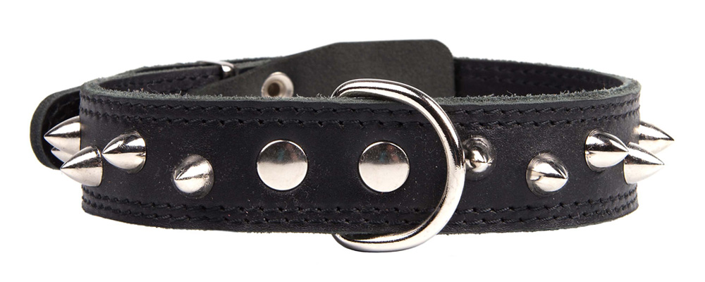 Двухслойный ошейник из натуральной кожи, украшенный шипами, проклеен, прошит декоративной строчкой, полукольцо посередине.