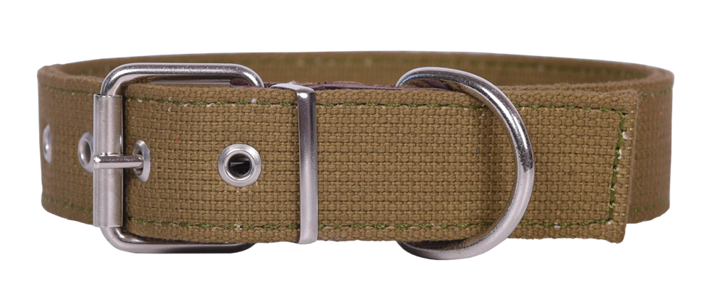 Ошейник двухслойный из брезентовой ленты ЛРТо, прошитый. Материал - хлопок. Толщина (мм): 2,9 ± 0,3. Разрывная нагрузка: 290 кгс. Вставки под фурнитуру из натуральной кожи. Отверстия укреплены металлической блочкой. Цвет хаки.