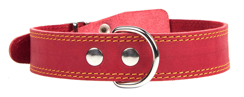 Однослойный ошейник из натуральной кожи, прошит декоративной строчкой, полукольцо посередине.