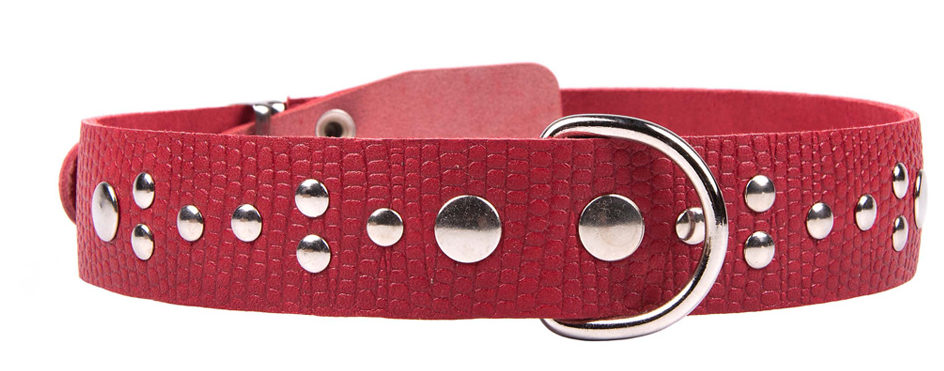 Однослойный ошейник из тисненой натуральной кожи, украшенный металлическими заклепками, не прошитый, полукольцо посередине.