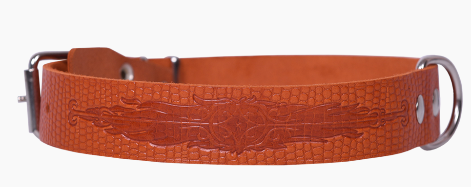 Однослойный ошейник из тисненой натуральной кожи с тиснением, не прошитый, полукольцо посередине.
