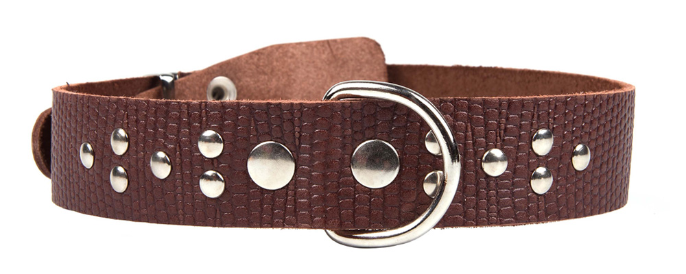 Однослойный ошейник из тисненой натуральной кожи, украшенный металлическими заклепками, не прошитый, полукольцо посередине.
