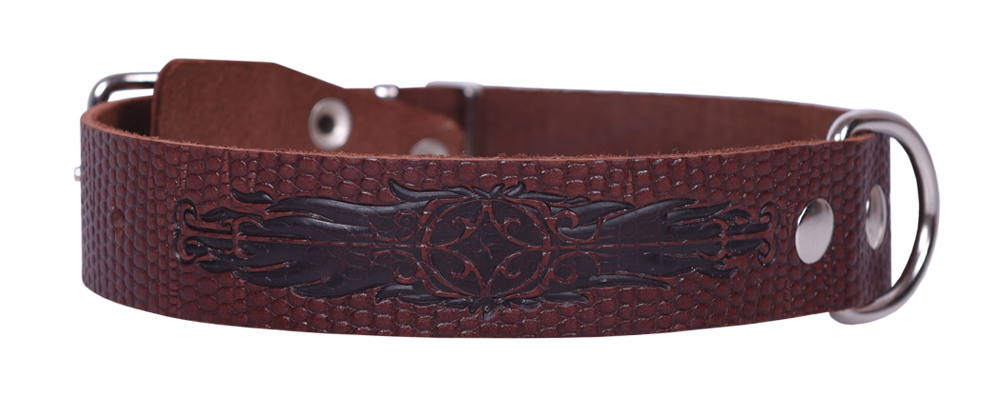 Однослойный ошейник из тисненой натуральной кожи, украшенный фактурным тиснением, не прошитый, полукольцо посередине.
