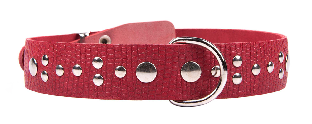 Однослойный ошейник из тисненой натуральной кожи, украшенный металлическими заклепками, не прошитый, полукольцо посередине.