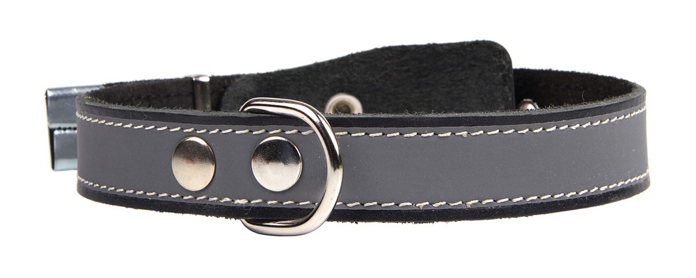 Однослойный ошейник из натуральной кожи со светоотражающей полосой, прошит декоративной строчкой, снабжен металлическим наконечником, отверстия укреплены металлической блочкой, полукольцо посередине.