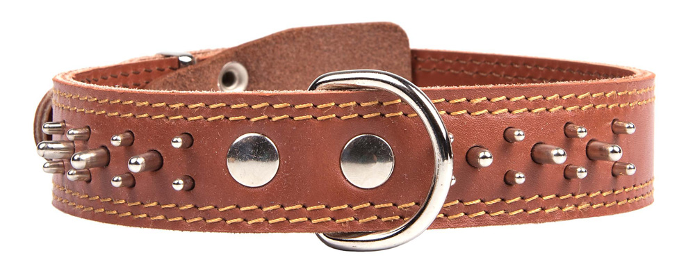 Двухслойный ошейник из натуральной кожи с украшением "еж", проклеен, прошит декоративной строчкой, полукольцо посередине.