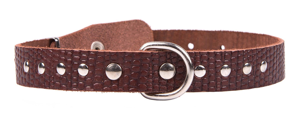 Однослойный ошейник из тисненой натуральной кожи, украшенный металлическими заклепками, не прошитый, полукольцо посередине.