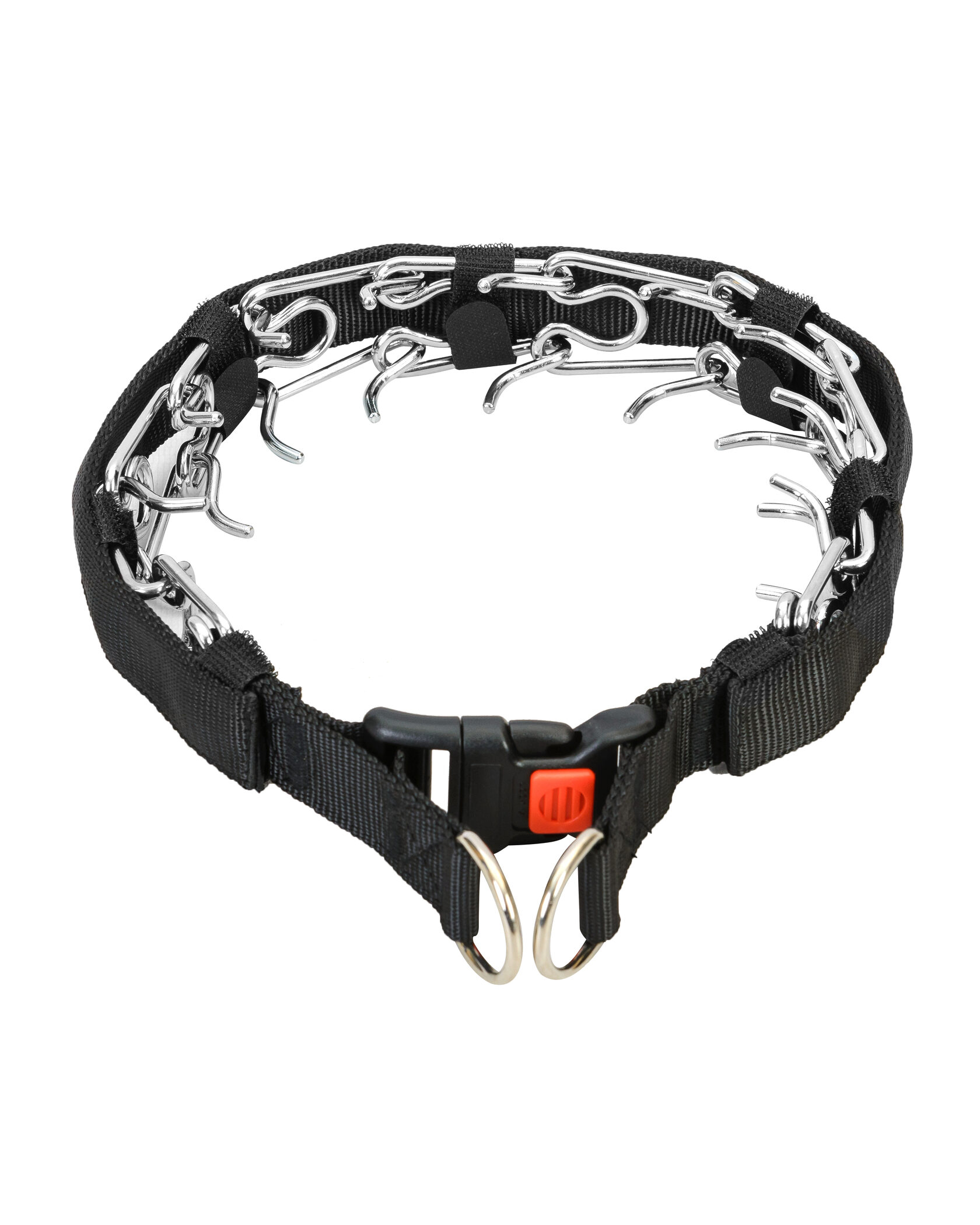 Строгий металлический ошейник предназначен для коррекции поведения и дрессировки собак. Ошейник оснащен дополнительно прочным нейловым ремнем с кольцами для крепления поводка. Качественно отполированные звенья не повреждают кожу питомца и не окрашивают его шерсть. Металлический ошейник - исключительно прочный на разрыв и долговечный аксессуар.