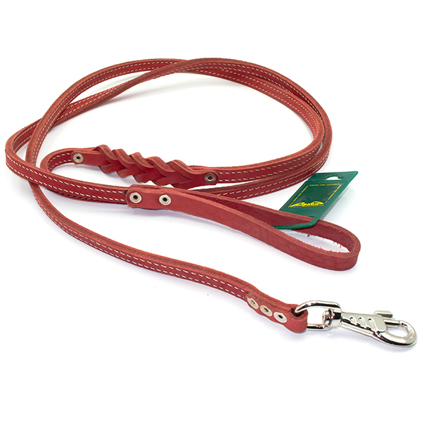 Поводок кожаный для собак из двух слоев кожи, украшенный декоративной строчкой и плетением посередине.