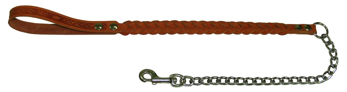 Поводок, плетеный вручную из 2-х полос натуральной кожи шириной по 16 мм, с металической цепочкой.
