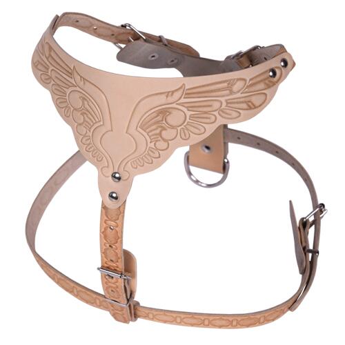 Шлейка для средних пород собак, из натуральной кожи, однослойная. Удобный нагрудный треугольник с изысканным тиснением. 4 регулировочных ремня для подгонки размера.