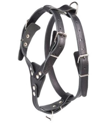 Шлейка из 2-х слоев натуральной кожи, прошитая. Нагрудный треугольник, 4 регулировочных ремня для подгонки размера. Назначение: для прогулок, дрессировки, служебной работы.