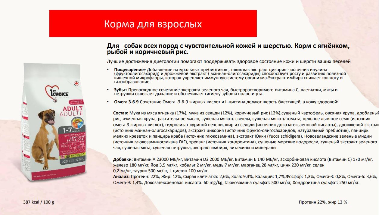 1ST CHOICE - для собак всех пород от 1 до 7 лет с чувствительной кожей и шерстью. Формула с ягнёнком, рыбой и коричневым рисом. Для животных с аллергией на курицу.