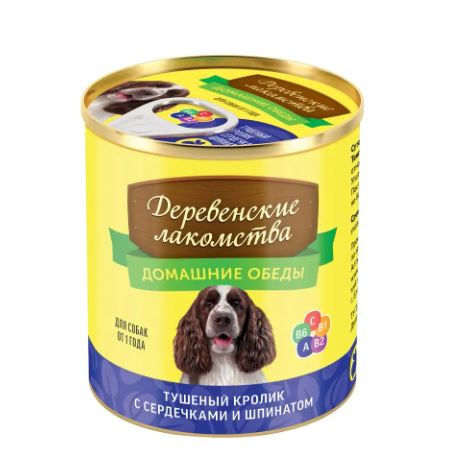 Деревенские лакомства консервы для собак Кролик тушеный с сердцем и шпинатом 240 г