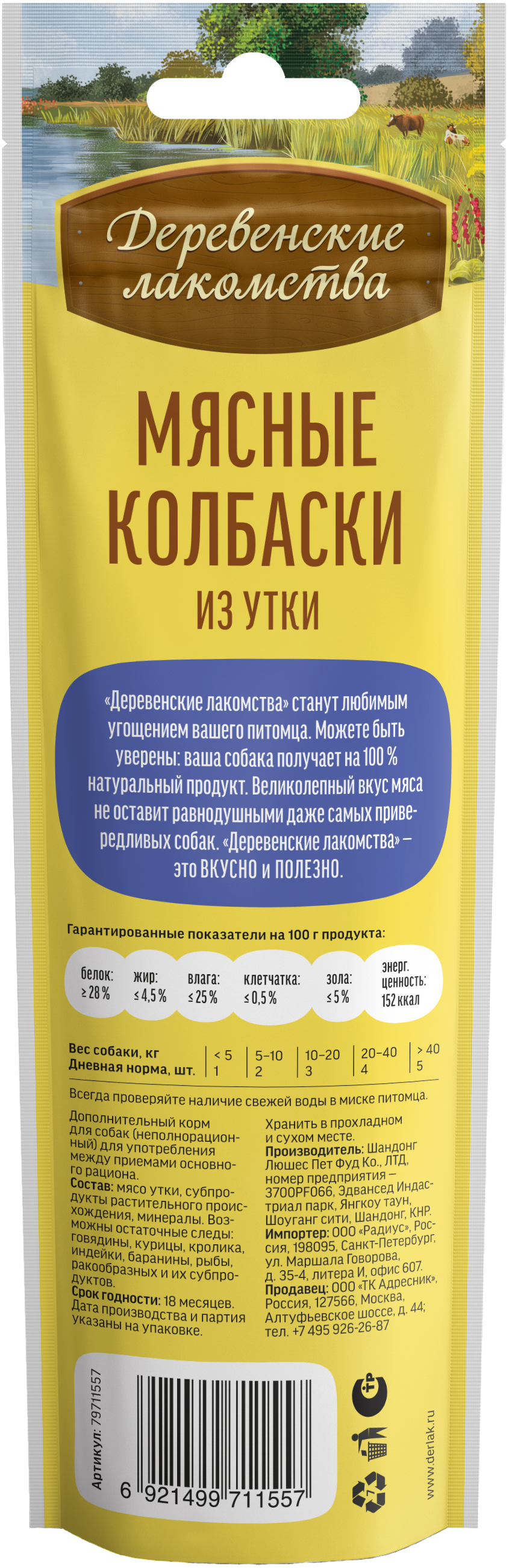 Деревенские лакомства для собак Мясные колбаски из Утки 45 г для собак