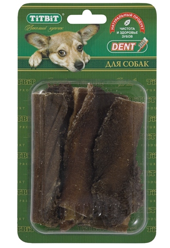 Высушенные пластины говяжьего рубца.Упаковка содержит 5-6 пластин длиной 11 см. Рубец говяжий представляет собой часть желудка КРС, точнее - первый из его преджелудков, в котором содержится полезная микрофлора. Ворсинки неочищенного сушёного рубца сохраняют на себе ферменты и витамины группы «В», вырабатываемые его микрофлорой при жизни животного. Содержат низкокалорийный, легкоусвояемый белок. Благодаря особой технологии сушки сохраняется до 60% процентов полезных веществ. Рубец говяжий способствует улучшению пищеварения и устранению дисбактериоза.