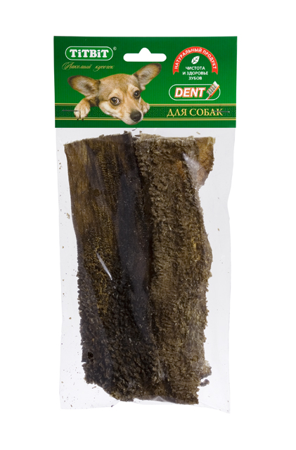 Высушенные пластины говяжьего рубца. Упаковка содержит 5-6 пластин длиной 19 см. Рубец говяжий представляет собой часть желудка КРС, точнее - первый из его преджелудков, в котором содержится полезная микрофлора. Ворсинки неочищенного сушёного рубца сохраняют на себе ферменты и витамины группы «В», вырабатываемые его микрофлорой при жизни животного. Содержат низкокалорийный, легкоусвояемый белок. Благодаря особой технологии сушки сохраняется до 60% процентов полезных веществ.
