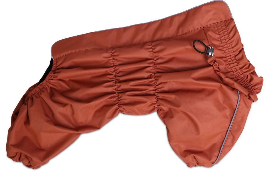 Застежка - молния. Ветрозащитный клапан на молнии. Светоотражающие полоски. На горловине имеются фиксаторы, которые позволяют регулировать ее по размеру питомца.