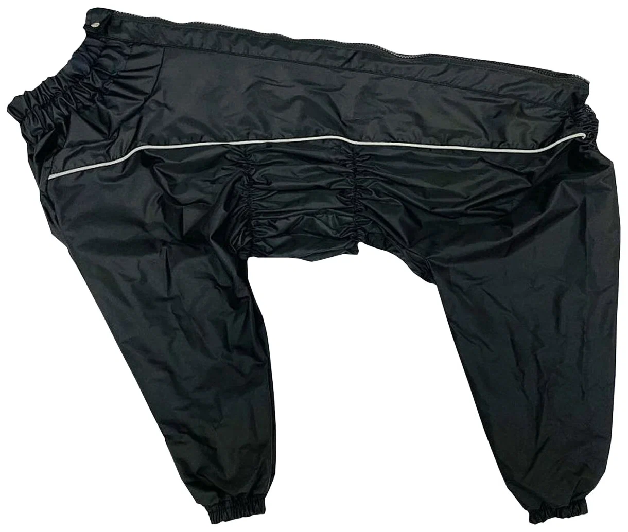 На воротнике имеется кнопка для фиксации. Комфортная посадка по корпусу достигается за счет резинок-утяжек под грудью и животом. Низ штанин сборен на резинку, при желании можно подвернуть.
