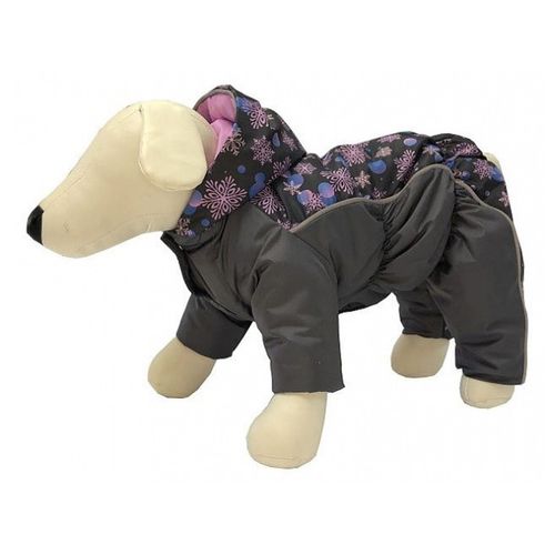 Зимний комбинезон для собак для сук, состоит из: - водоотталкивающей и ветрозащитной ткани (100% полиэстер), обработанной водоотталкивающей (PU) пропиткой (верхний слой), утепленной и простеганной подстежкой (внутренний слой).