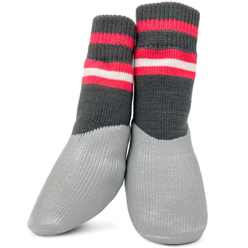 Комплект носков для собак "Полоски" состоит из четырех изделий, выполненных преимущественно из хлопка с водостойким нитриловым покрытием на подошве. Нитриловое покрытие изготавливают из искусственно синтезированного каучука, пришедшего на смену натуральному латексу. Нитрил не вызывает аллергии, более прочный и износостойкий. Используя такие носочки на улице, Вы защитите лапы собаки от снега, слякоти, реагентов и порезов. В домашних условиях такие носочки ограждают интерьер от когтей любимца и, благодаря противоскользящему покрытию, позволяют четвероногому питомцу с комфортом передвигаться по паркету, кафелю и другим скользким покрытиям. Носочки легко одевать, а благодаря эластичным резинкам они не слезают с лап животного. Изделия просты в уходе и избавят вас от регулярного мытья лап собаке после прогулки. Цвет: серо-черный с красным.Размеры изделия: 40*110мм.