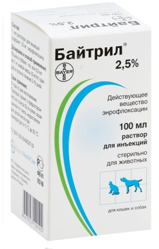 Байтрил 2,5% инъекционный раствор вводят собакам и кошкам подкожно или внутримышечно в дозе 0,2 мл на 1 кг массы животного (5 мг энрофлоксацина на 1 кг массы) один раз в сутки в течение 3 – 10 дней. В связи с возможной болевой реакцией препарат не следует вводить животному в одно место в объеме, превышающем 2,5 мл. Если в течение 3 – 5 дней не произойдет заметного клинического улучшения, рекомендуется провести повторную проверку на чувствительность выделенных от больного животного микроорганизмов к фторхинолонам или заменить Байтрил на другой антибактериальный препарат.