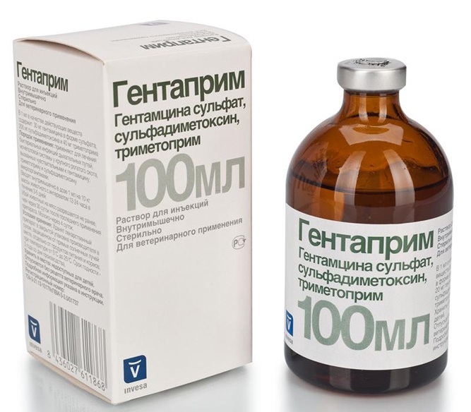 Состав: в 1 мл в качестве действующих веществ содержится 30 мг гентамицина в форме сульфата (соответствует 20 мг гентамицина), 200 мг сульфадиметоксина и 40 мг триметоприма.