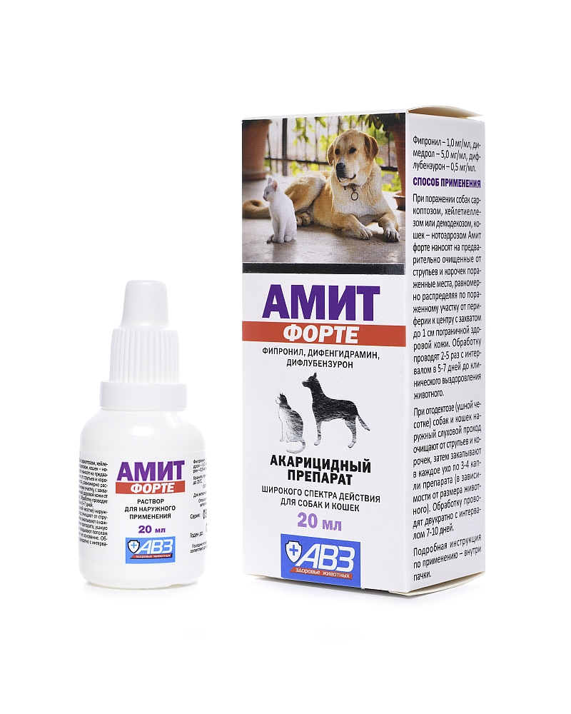 Амит форте назначают собакам и кошкам с лечебной целью при саркоптозе, нотоэдрозе, отодектозе, хейлетиеллезе и демодекозе. При поражении собак саркоптозом, хейлетиеллезом или демодекозом, кошек - нотоэдрозом Амит форте наносят местно на предварительно очищенные от струпьев и корочек пораженные места, равномерно распределяя по пораженному участку с захватом до 1 см пограничной здоровой кожи от периферии к центру. При отодектозе (ушной чесотке) собак и кошек наружный слуховой проход очищают от струпьев и корок, затем закапывают в каждое ухо по 3-4 капли препарата.