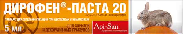 Дирофен-пасту назначают грызунам массой тела от 1 до 5 кг (морские свинки, кролики, хорьки и др.) с профилактической и лечебной целью при нематодозах (токсокароз, токсаскаридоз, унцинариоз, анкилостомоз) и цестодозах (тениидозы, дипилидиоз, эхинококкозы, дифиллоботриоз, мезоцестоидоз).