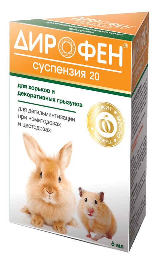 Дирофен-суспензия 20 относится к комбинированным антигельминтным препаратам. Обладает широким спектром антигельминтного действия на половозрелые и личиночные стадии развития круглых и ленточных гельминтов, паразитирующих у собак, кошек и хорьков (Тохосаra саnis, Тохосаra mystax, Toxascaris leonina, Taenia solium, Uncinaria stenocephala, Trichuris vulpis, Ancylostoma caninum, Echinococcus granulosus, Alveococсus multilocularis, Mesocestoides lineatus, Dipylidium caninum, Diphyllobothrium latum, Multiceps multiceps) и у декоративных грызунов (Syphacia obvelata, Syphacia muris, Aspiculuris tetraptera, Rodentolepis straminea, Hymenolepis nana, Hymenolepis diminuta).