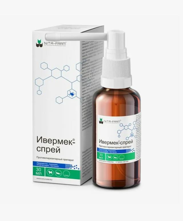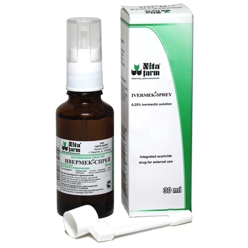 Ивермек®-спрей – комплексное акарицидное лекарственное средство применяют для лечения собак, кошек, пушных зверей и декоративных грызунов при саркоптозе, отодектозе, нотоэдрозе, псороптозе и демодекозе, декоративных птиц – при кнемидокоптозе. Лекарственная форма: раствор для наружного применения. По внешнему виду препарат представляет собой прозрачную жидкость от бесцветного до светло-желтого цвета.