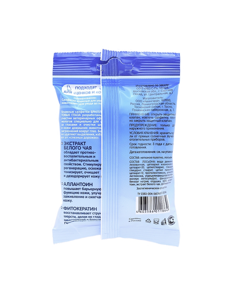 Салфетки разработаны при участии ветеринарных офтальмологов специально для ухода за глазами и очистки шерсти и кожи вокруг глаз животного. Они бережно удаляют выделения из глаз. Избавляют от «слёзных дорожек». Способствуют устранению запаха от выделений из глаз. Подходят для применения котятам и щенкам.
