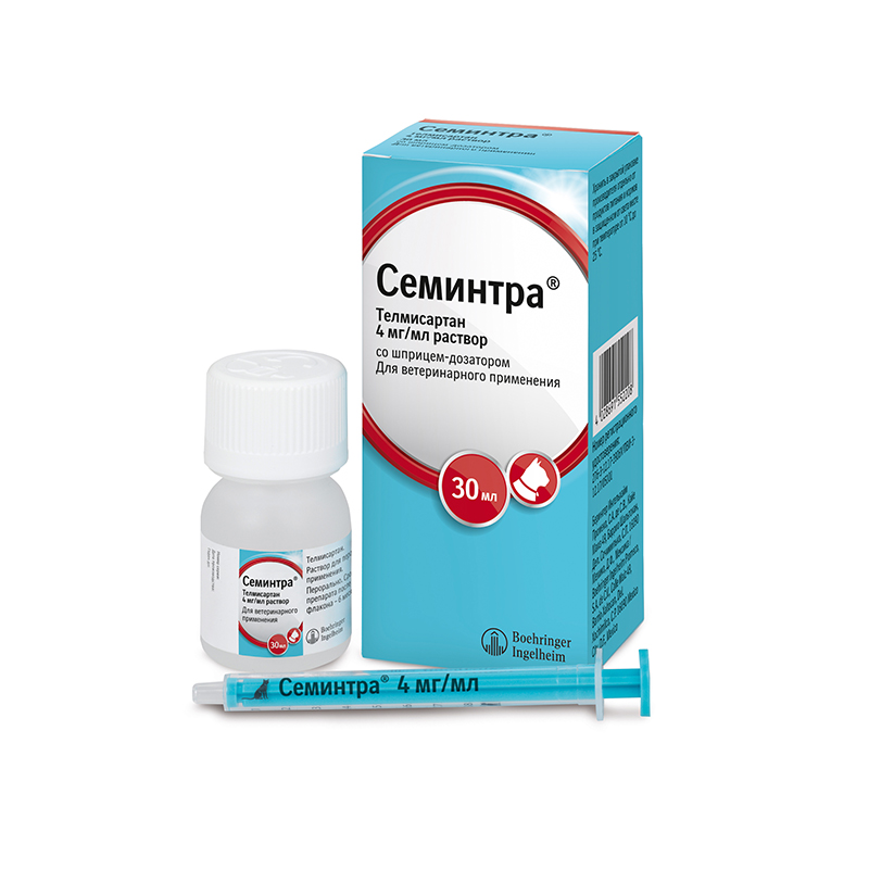 СЕМИНТРА раствор для перорального применения, 30 мл Препарат для кошек. Применяют для лечения ХБП и дозозависимого снижения артериального давления и протеинурии. Порядок применения Семинтра® назначают для снижения уровня протеинурии при хронической болезни почек (ХБП) у кошек, как средство монотерапии. Применяют кошкам, достигшим 6-ти месячного возраста, перорально один раз в сутки, при помощи шприца-дозатора.