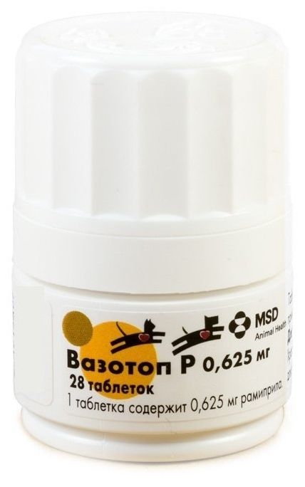 Вазотоп Р — гипотензивное лекарственное средство. Рамиприл, входящий в состав препарата, является ингибитором ангиотензин-превращающего фермента (АПФ), который, подавляя синтез ангиотензина II, снижает его сосудосуживающее действие и стимулирующее влияние на секрецию альдостерона, а также ингибирует распад брадикинина. Рамиприл не оказывает существенного влияния на почечный кровоток (в некоторых случаях повышает его) и на скорость клубочковой фильтрации. Препарат не вызывает развитие компенсаторной тахикардии. Максимальный гипотензивный эффект развивается через 1 – 3 часа после приема препарата и продолжается на протяжении суток. При ежедневном приеме Вазотопа Р снижение артериального давления происходит постепенно в течение 3 – 4 недель и сохраняется в пределах физиологической нормы в течение всего периода лечения. Резкая отмена препарата не приводит к быстрому повышению артериального давления. Вазотоп Р оказывает кардиопротективное действие за счет торможения АПФ в миокарде и накопления брадикинина, а также способствует обратному развитию гипертрофии миокарда у животных, больных артериальной гипертензией. После приема внутрь рамиприл быстро всасывается в количестве, составляющем не менее 50 – 60 % от принятой дозы. Первичный метаболизм рамиприла происходит в печени. При этом образуется производное рамиприла — рамиприлат. Рамиприлат примерно в 6 раз более активно ингибирует АПФ, чем рамиприл. Связывание с белками плазмы составляет для рамиприла — 73 %, а для рамиприлата — 56 %. После ежедневного однократного приема Вазотопа Р устойчивая концентрация рамиприлата в плазме достигается к 4 дню. Около 60 % лекарственного средства выводится с мочой и около 40 % — с калом (преимущественно в виде метаболитов). При нарушениях функции почек экскреция рамиприла и его метаболитов замедляется пропорционально снижению клиренса креатинина. По степени воздействия на организм теплокровных животных Вазотоп Р относится к малоопасным веществам.