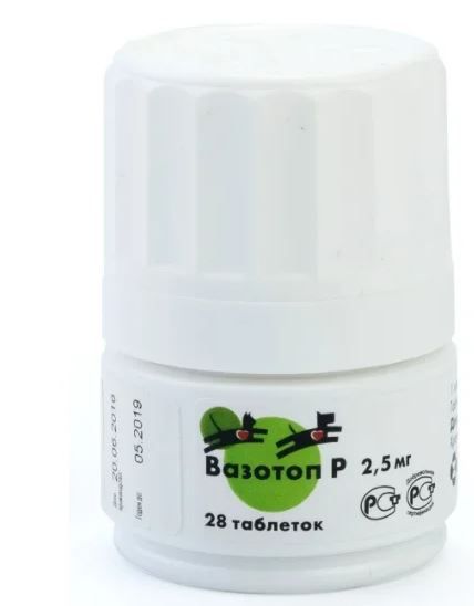 Вазотоп Р — лекарственный препарат для контроля артериального давления у кошек и собак. Действующее вещество, в 1 таблетке Рамиприл — 0,625 мг; 1,25 мг; 2,5 мг. Показания к применению Вазотоп Р применяют для снижения систолического давления у кошек и собак (если значение систолического давления находится в промежутке от 160 и 230 мм рт. ст.). Лекарственная форма Таблетки для перорального применения. Форма выпуска Вазотоп Р выпускают в форме таблеток продолговатой формы с бороздкой посередине. Таблетки упакованы по 28 штук в пластиковые флаконы с закручивающимися колпачками с защитой от детей и влагопоглощающей мембраной. Срок годности и условия хранения 3 года при температуре 2-30°С